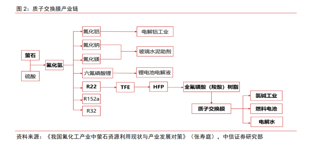 質子交換膜處於有機氟化工產業鏈末端,其上游是有機氟化工的單體材料,下游是基於質子交換膜的氯鹼工業、燃料電池、電解水、儲能電池等應用領域。從上游來看,質子交換膜的直接材料為全氟磺酸樹脂材料,向上延伸至有機氟化工中的四氟乙烯、全氟烷基乙烯基醚等單體材料,向上溯源可以追溯至螢石、氟化氫、製冷劑等原材料,從下游看,質子交換膜應用廣泛,主要應用於氯鹼工業、燃料電池、電解水、儲能電池等領域,其中氯鹼工業與燃料電池為主要應用領域。