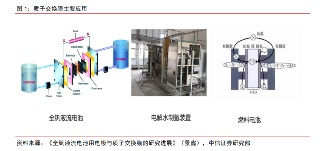 質子交換膜應用於氯鹼工業、燃料電池等領域。質子交換膜在氫燃料電池、電解水制氫氣等領域中所交換的陽離子為質子(氫離子H+),在氯鹼工業中,所交換的陽離子為鈉離子(Na+),又被稱為離子膜。目前產業化應用的均為全氟質子交換膜,質子交換膜使用的是全氟磺酸樹脂,離子膜使用全氟磺酸樹脂、全氟羧酸樹脂的複合膜。全氟磺酸樹脂具有強酸性,全氟羧酸樹脂具有弱酸性,更能夠適應氯鹼工業中的鹼性環境。