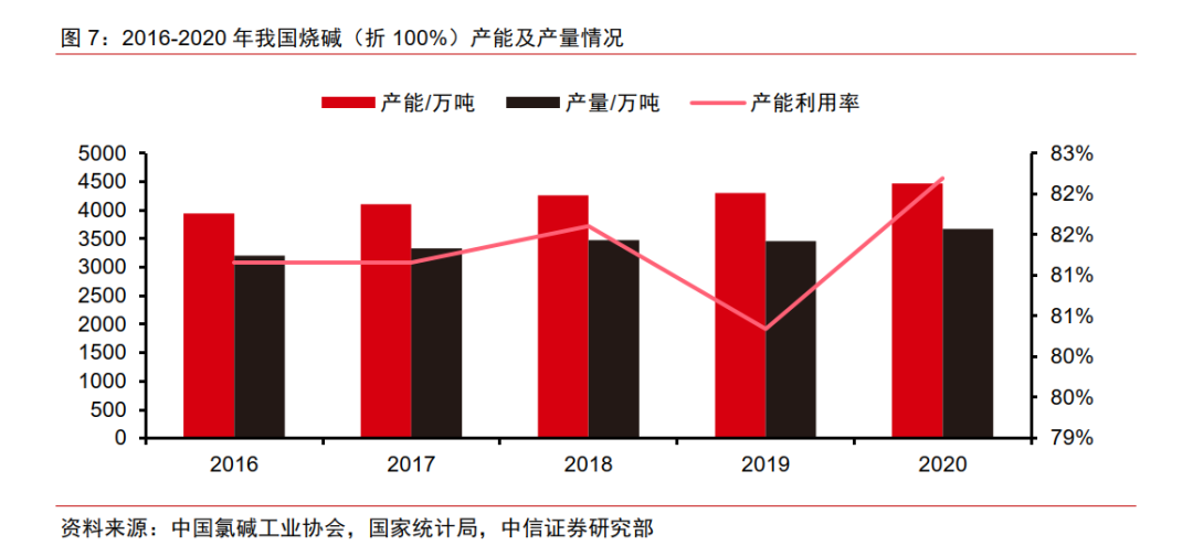 氯鹼行業開工率保持高位,產能受到政策限制。氯鹼工業是高耗能行業,國家對新進產能有明確限制,對於新建燒鹼裝置起始規模必須達到30萬噸/年及以上,對於新進產能只能通過對原有產能進行等量或者減量置換。內蒙古自治區從2021年起不再審批燒鹼產能,確有必要建設的,須在區內實施產能和能耗減量置換。短期來看我國氯鹼工業產能基本保持穩定,增速緩慢。根據氯鹼工業協會的統計,在旺盛的下游需求下,以燒鹼生產為例,近五年燒鹼產能始終保持高開工率,開工率在80%以上。