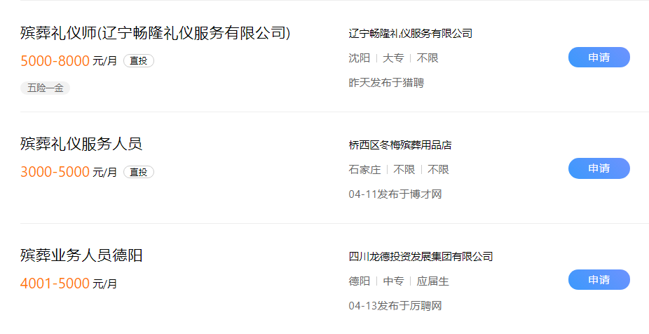 在招聘網站上的搜索「殯葬禮儀師」,各地的薪資也普遍在這一水平。