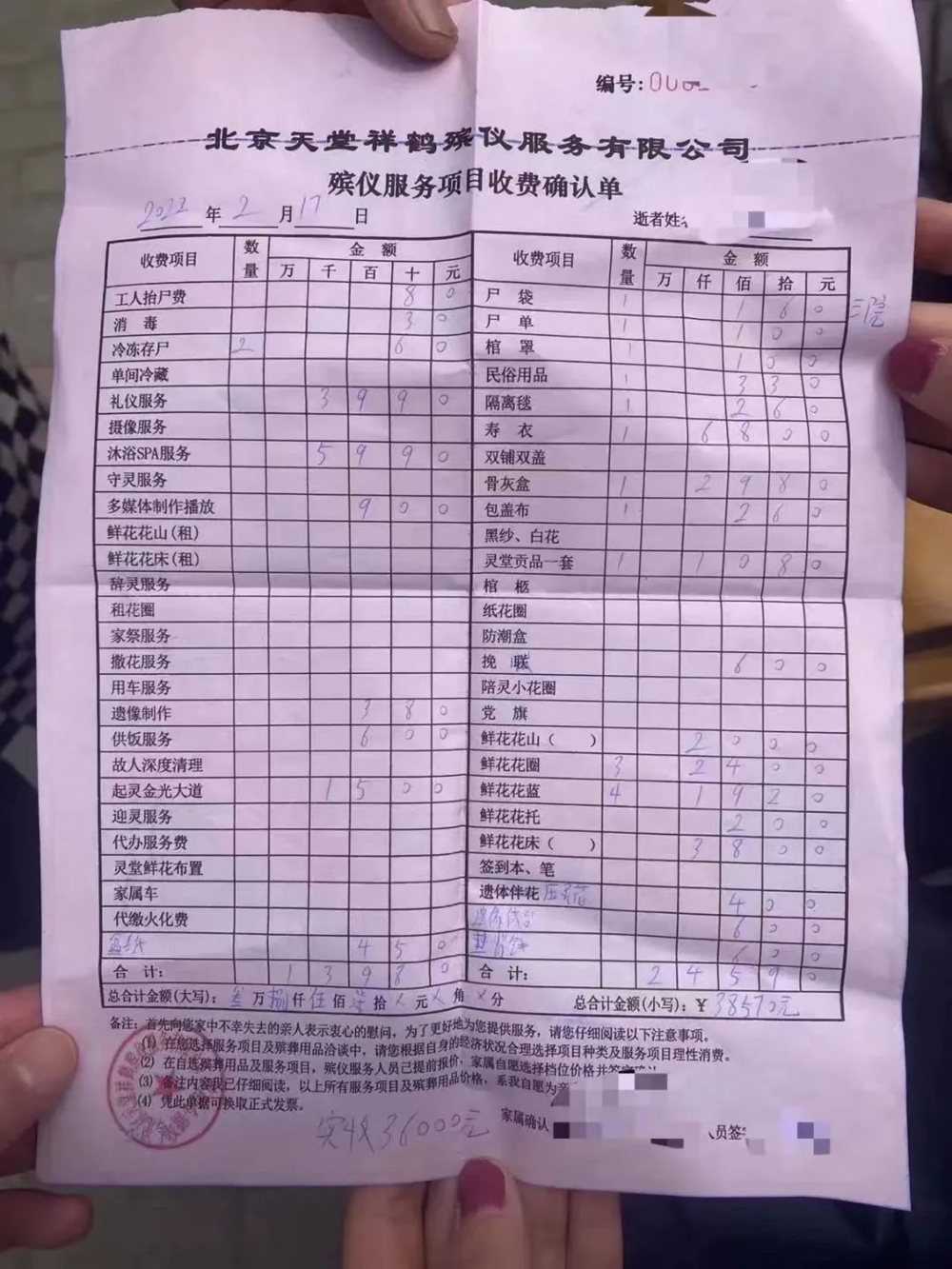 在舉報者提供的收費清單里可以看到,3.8萬元的天價費用並非屍體停放的費用,而是全套的殯葬服務費用,其中類似工人抬屍、消毒、停屍等基礎費用,均不過幾十元錢。