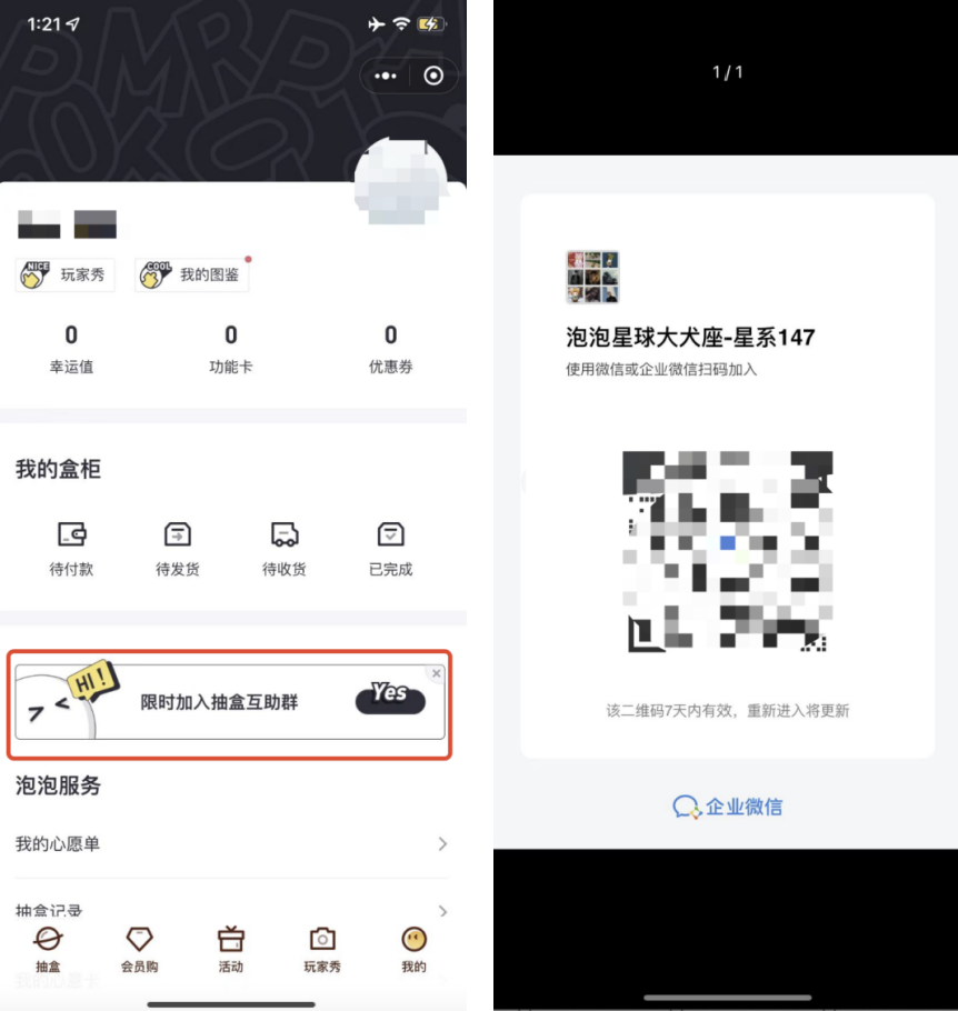 線下門店: 在泡泡瑪特門店的收銀臺前,都會有入羣的二維碼台卡引導,包括店員也會通過福利引導客户加微信入羣。