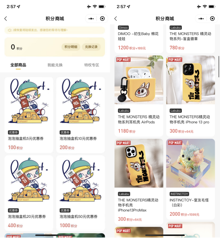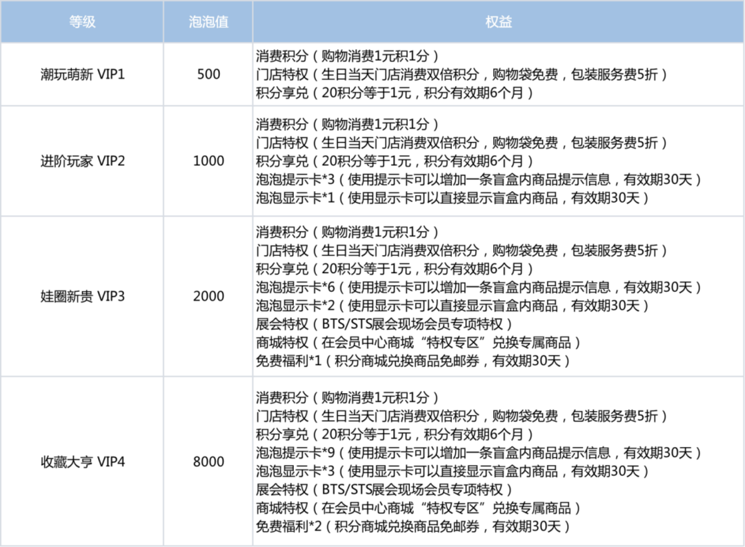 泡泡瑪特按照泡泡值將用户分為4個等級,具體權益如下: