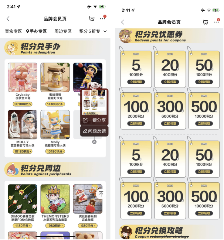 目前泡泡瑪特在微信小程序和電商平臺中有會員的體系,小程序中包含成長型會員和付費會員,京東和天貓上只有簡單的成長型會員,兩者都擁有積分的體系。
