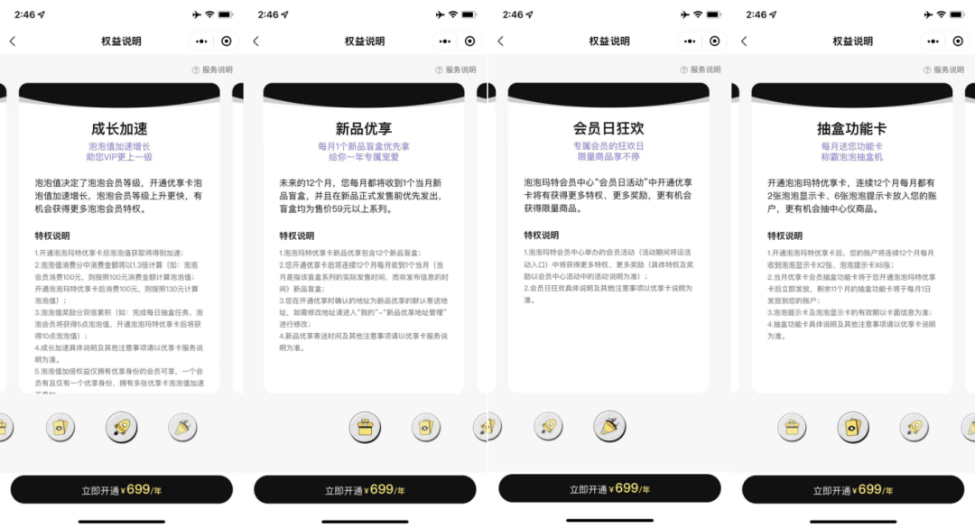 泡泡瑪特的付費會員為699元/年,可享受新品優享、歐氣加倍、成長加速、會員日狂歡4項權益,具體如下。