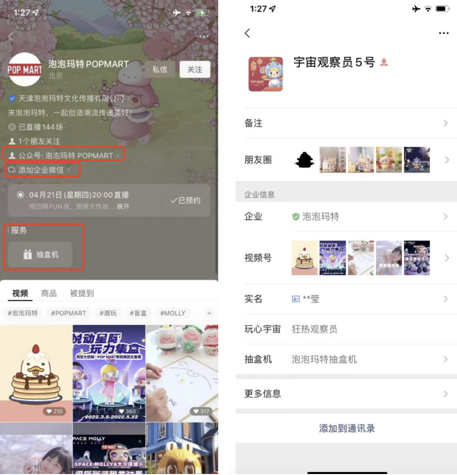 視頻號:視頻號主頁鏈接了公眾號、企業微信、小程序,三個入口均可以添加到私域。主要的視頻內容以品牌宣傳、IP宣傳片為主。除此之外,視頻號也會不定期開啟直播,既能直播帶貨也能增強品牌曝光。