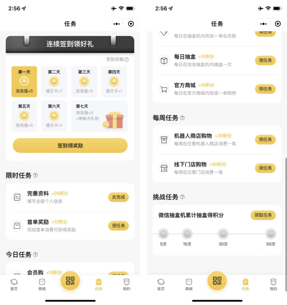 用户消費可獲得積分,每消費1元積1分,另外可通過每日簽到、每日任務、限時任務、每周任務和挑戰任務來獲取積分。
