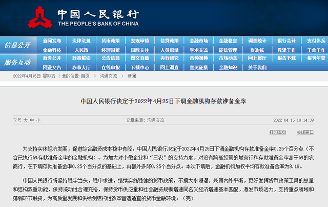 4月15日,降準如期而至。央行宣佈下調金融機構存款準備金率0.25個百分點,對沒有跨省經營的城商行和存款準備金率高於5%的農商行額外多降0.25個百分點。