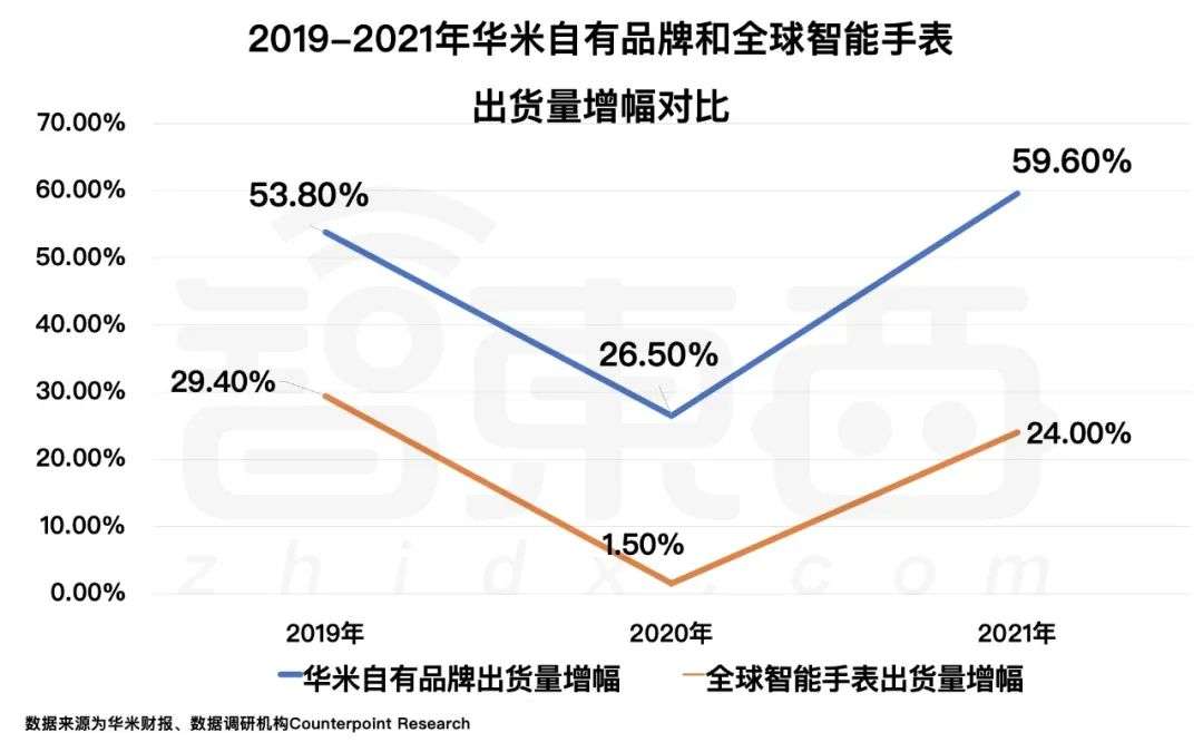 ▲2019-2021年華米科技自有品牌出貨量增幅與全球智能手錶出貨量增幅變化對比(數據來源為華米財報、數據調研機構Counterpoint Research)