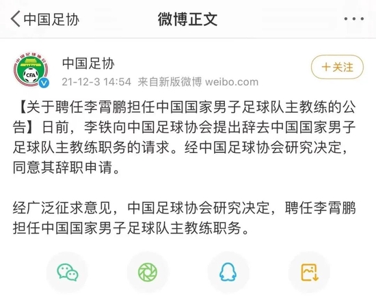 宣佈李鐵辭職的同時,中國足協也宣佈,李霄鵬將擔任新一屆國家隊主教練。李霄鵬是同輩人,也是那個年代的參與者和見證者,在2019年底的競聘中輸給了李鐵。這一次,他的上任是由體育總局欽點的。李鐵下課前,李霄鵬就被總局領導叫到北京——即便李鐵不主動辭職,也難逃下課的命運。