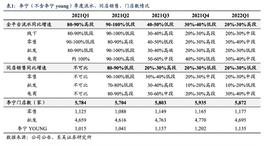 數據顯示,李寧(不包括李寧YOUNG)在整個平臺的同店銷售按年取得20%-30%的低段增長;另外,截至2022年3月31日,李寧和李寧YOUNG在中國市場的銷售點數量合計淨減少了130個。零售方面,李寧銷售點(不包括李YOUNG)於整個平臺的零售流水按年錄得20%-30%高段增長,為近三年最好成績。
