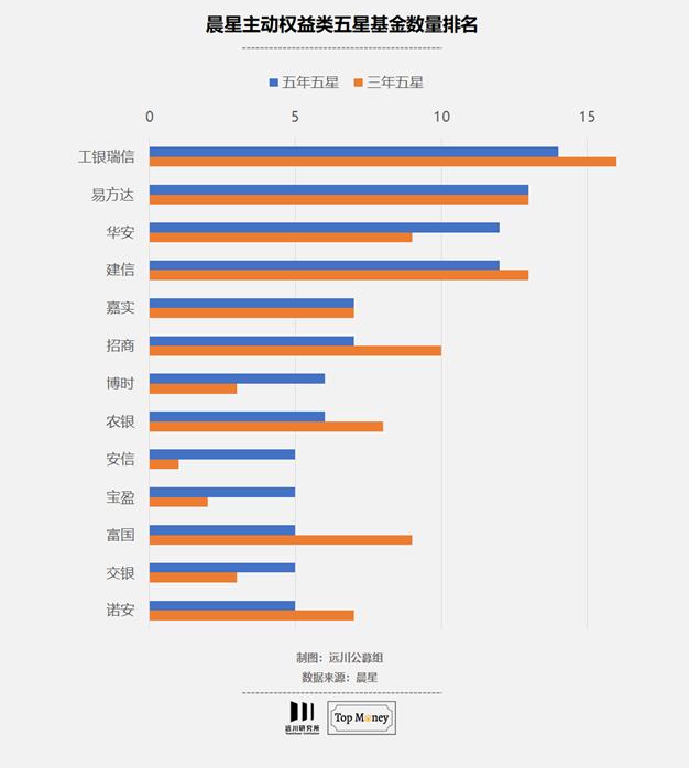 作為國內最大的老牌「銀行系」基金公司工銀瑞信,在權益類五星基金評比中可謂是出類拔萃。晨星官方數據顯示,工銀瑞信權益類三年期五星和五年期五星基金數量分別為16只和14只,均居行業首位。