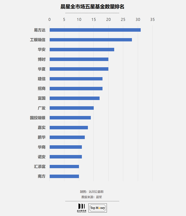 而在獲得五星評級的基金中,頭部基金公司的產品數量遙遙領先。統計顯示,五星基金數量排名前三的基金公司分別為易方達基金、工銀瑞信基金和華安基金,分別為31只、28只和22只。晨星五星基金數量超過10只的基金公司一共16家,絕大多數為管理規模排名前20的頭部基金公司。