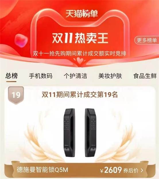 為什麼這麼説?指紋、密碼一直是日韓智能鎖品牌例如三星等常用的開鎖方式,2019年,國貨品牌德施曼率先研發上市了3D人臉智能鎖,首創智能鎖領域人臉識別技術,開啟了新的歷史,這一舉動也強力衝擊了全球市場。而后德施曼二代升級產品再次發佈。其中德施曼Q5M在去年雙十一還與Apple蘋果13等入選天貓雙11全類目總榜TOP20。國貨品牌至少領先了日韓一至二代,逐漸引領全球智能鎖行業。