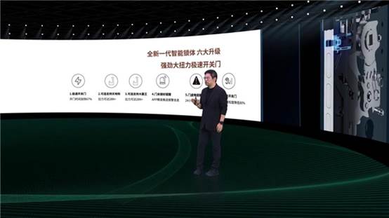其次,首創全新一代智能鎖體。融合了目前市面上電子鎖體和機械鎖體兩大鎖體的優勢,通過六大升級,強勁大扭力極速開關門,還能帶動天地鈎,適配性更高。
