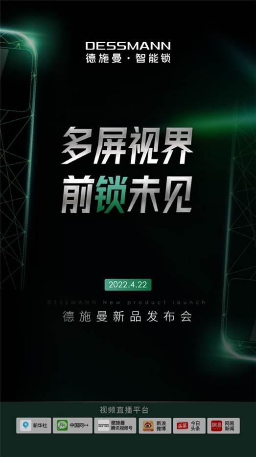 4月22日,德施曼「多屏視界 前鎖未見」2022新品發佈會攜旗艦智能鎖Q50系列來襲,將潮流酷炫元素與前沿技術相融合,為全球家庭打造了更高端、全能的智慧守護者。新華社、網易新聞等視頻直播平臺以及騰訊視頻號、天貓、京東等平臺官方賬號同步直播。