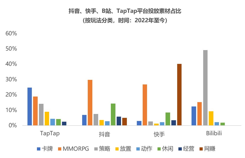 這反映出22年以來,越來越多的遊戲廠商開始選擇TapTap這一新興渠道。從玩法來看,22年以來,在TapTap平臺投放遊戲居前三的玩法分別是:卡牌、MMORPG和策略。