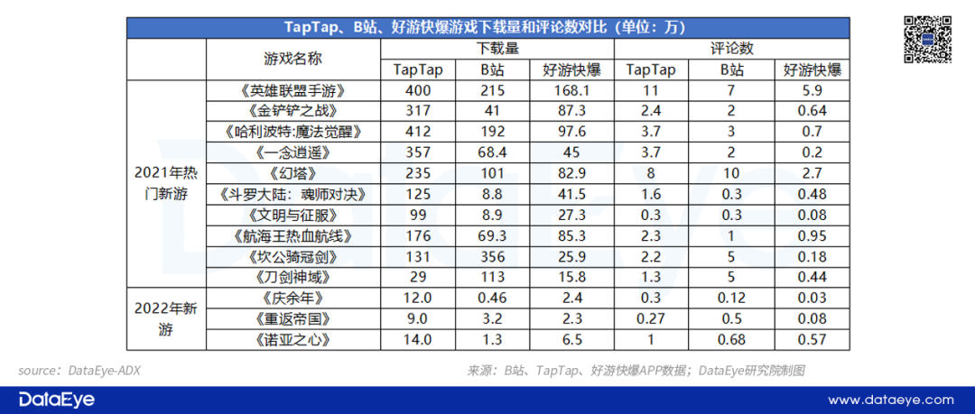 如果對比」下載量/評論數」,B站13款遊戲平均每30次下載就會留下一條評論,TapTap和好遊快爆這一指標分別為81和106,這説明B站遊戲區社區氛圍更好,用户粘性更強,而TapTap和好遊快爆工具屬性較強,用户「用完即走」。