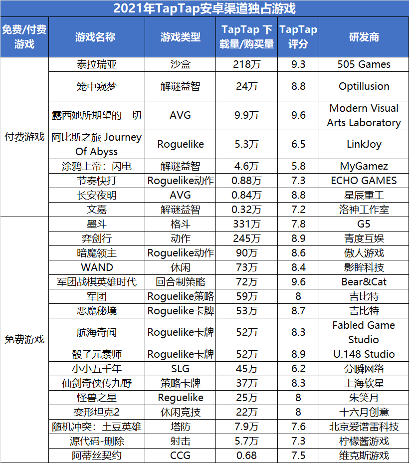在2020年,TapTap曾拿下《帕斯卡契約》、《江南百景圖》等遊戲安卓獨佔權,但21年以來TapTap獨佔遊戲並沒有出現這類爆款。