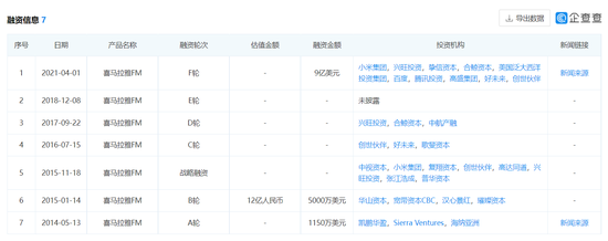 歷史上,喜馬拉雅一共進行過多達7輪融資。據投中網消息稱,其最新一輪融資發生於2021年4月,騰訊、閲文、百度、高盛等參與了E-4輪9億美元融資,投后估值達43億美元,約合270億元人民幣。