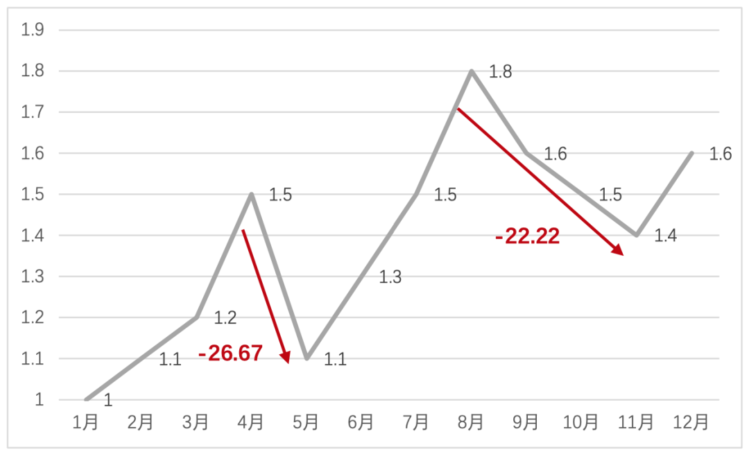 比如假設某基金一年內的淨值走勢如下圖,總共經歷了兩次下跌。從4月的1.5元下跌到5月的1.1元,跌幅為26.67%。隨后在8月上漲到1.8元,然后再次下跌到11月的1.4元,此次跌幅22.22%。那麼這一年該基金的最大回撤是26.67%。