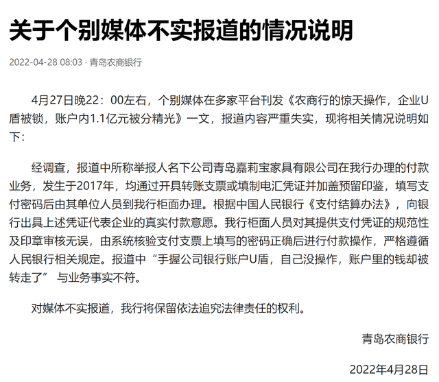 4月28日,青島農商銀行在今日頭條官方賬號就此事發布聲明稱,個別媒體在多家平臺刊發《農商行的驚天操作,企業U盾被鎖,賬户內1.1億元被分精光》一文,報道內容嚴重失。