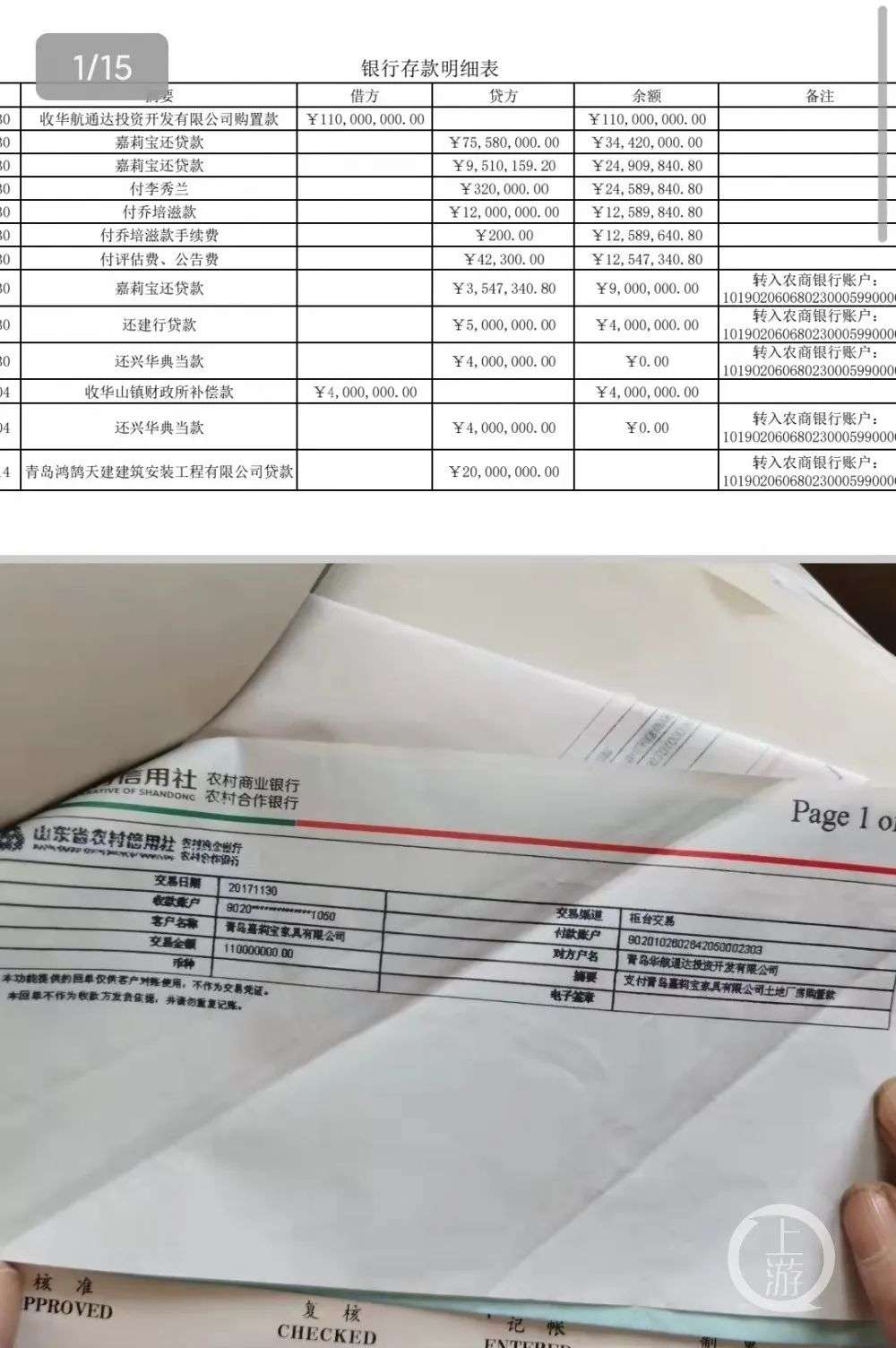 2017年11月30日,華航通達公司將1.1億元打到嘉莉寶公司青島農村商業銀行即墨支行的賬户,轉賬摘要註明為「土地廠房購置款」。