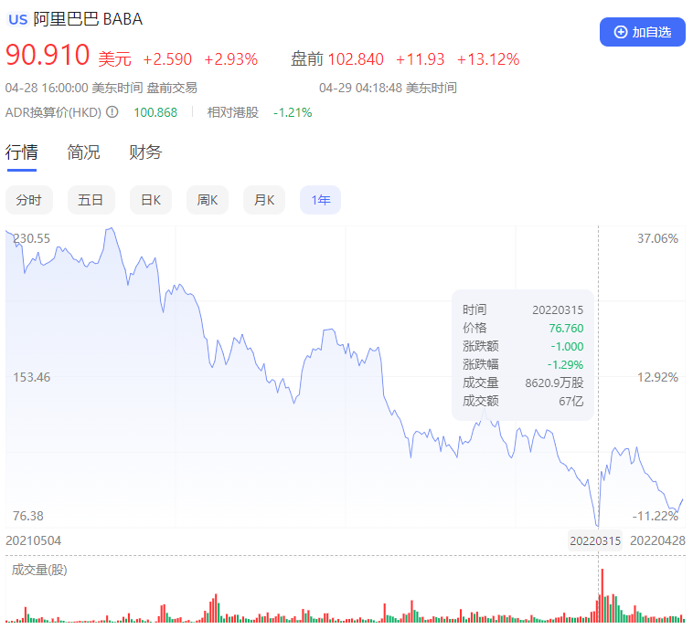 回看阿里的股價,在2020年11月到達巔峰,約為298美元/股,而到了現在,阿里股價最低僅有76美元左右,下跌幅度約為70%,根據最新市值計算,約1年半的時間,阿里的市值蒸發約6200億美元。