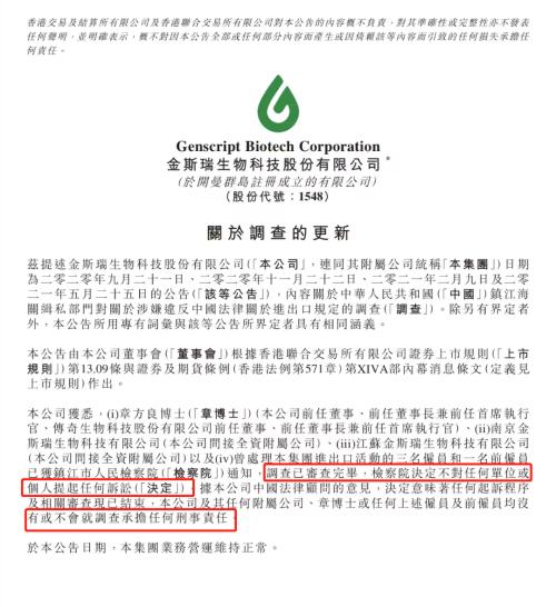 公告稱,金斯瑞前任董事、前任董事長兼前任首席執行官、傳奇生物科技股份有限公司前任董事、前任董事長兼前任首席執行官章方良博士,南京金斯瑞生物科技有限公司以及曾處理本集團進出口活動的三名僱員和一名前僱員,已獲鎮江市人民檢察院通知,調查已審查完畢,檢察院決定不對任何單位或個人提其任何訴訟。