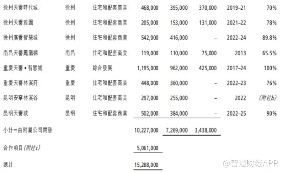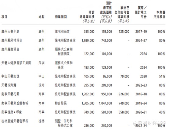 截至2021年12月31日,天譽置業項目組合與潛在土地儲備總建築面積為3300萬平方米,主要位於粵港澳大灣區廣州、深圳、中山、珠海、惠州,華南地區南寧及桂林、華東地區徐州及南昌,以及中國西南地區重慶、昆明及貴州。