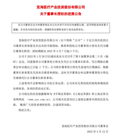 4月12日,覽海醫療公告,近日再次收到公司董事長密春雷先生出具的書面授權,推薦和授權公司董事倪小偉先生代為履行董事長職責,授權期限自2022年4月7日起3個月。