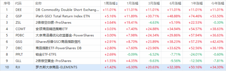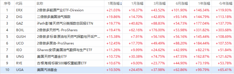 從ETF漲幅榜來看,位於漲幅榜前列的多為做多能源類的ETF。其中,位居漲幅榜首位的是2倍做多能源產業ETF $ERX ,周漲21.03%。