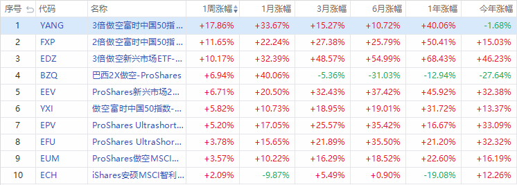 做空ETF中,3倍做空富時中國50指數 $YANG 周漲近18%;3倍看空房地產指數ETF $DRV 周漲11.65%;每日3倍做空標普生物技術ETF $LABD 周漲10.86%。
