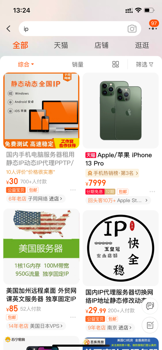 新京報貝殼財經在百度搜索IP代理,動態IP等仍有大量廣告和經營公司存在。淘寶、拼多多等也存在相關動態IP、IP更改的服務商品鏈接。各商家提供IP服務,包括靜態、動態代理IP,支持電腦、手機、模擬器等設備。存在包年、包月、日租等付費模式。