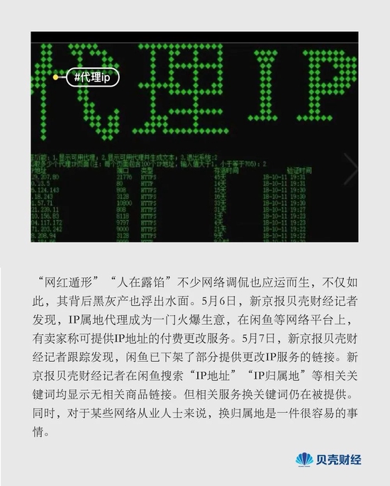 「網紅遁形」「人在露餡」不少網絡調侃也應運而生,不僅如此,其背后黑灰產也浮出水面。5月6日,新京報貝殼財經記者發現,IP屬地代理成為一門火爆生意,在閒魚等網絡平臺上,有賣家稱可提供IP地址的付費更改服務。