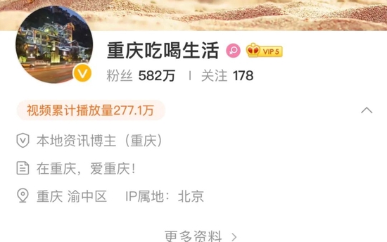同時,各地吃喝玩樂資訊等相關微博也被網友發現IP屬地與名稱不符,有微博網友發帖曝光一批冒充北上廣城市資訊的博主,雖然發帖內容是在北上廣吃喝玩樂,但IP顯示他們的發帖地址在湖南,新京報貝殼財經記者隨機點開部分微博有的屬地與名稱相符,有的則不同,例如」重慶吃喝生活「賬號,其IP屬地為北京。