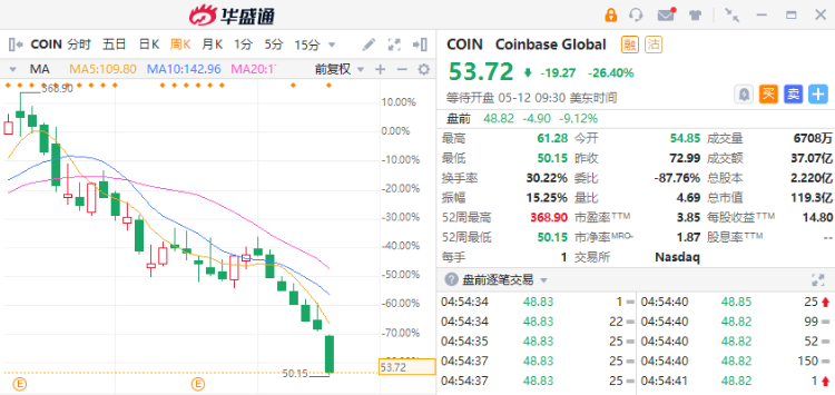 在財報發佈的后一個交易日(5月11日),Coinbase暴跌26.4%,股價據高點已經跌去85%,市值蒸發666億美元(約合4500億人民幣)。今日(5月12日)截至發稿,Coinbase盤前再度大跌9%。