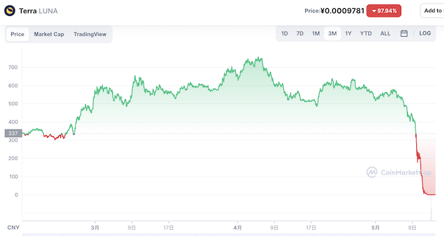 直至當地時間5月8日,UST和Luna幣雙雙開啟暴跌行情,Luna幣僅用一周時間價格歸零,至13日,UST價格跌至10美分,過去24個小時下瀉82%。