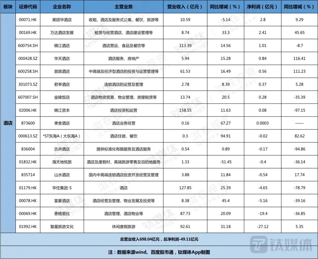 06、酒店板塊:近半數虧損,美麗華酒店、萬達酒店發展、錦江酒店淨利潤均超億元