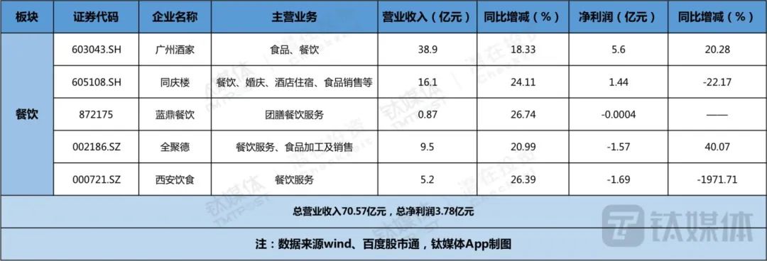 餐飲行業的上市公司並不多,鈦媒體App選取了與文旅地密切相關的5家企業進行統計,顯示僅有2家企業實現盈利。
