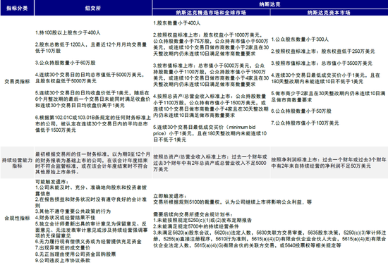 ► 非自願退市:即公司若不符合美國交易所的持續上市要求,將會觸發退市流程。納斯達克和紐交所針對不用類型的上市企業均設置了具有針對性的退市標準,標準強調市場指標,可有效篩選出無人問津、投資價值不被市場認可的企業。具體來説,紐交所主要對股東人數、社會公眾持股數量、交易量以及收盤價格等要點有明確要求,同時在規則中指出了部分其他可能導致摘牌的要素;納斯達克上市規則主要對股東權益金額、公眾流通股數及市值、做市商數量、上市股票總市值、部分財務指標進行了要求。