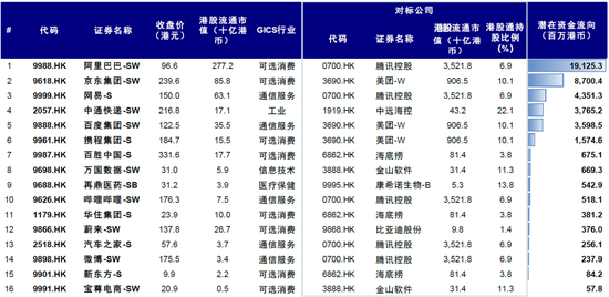 我們測算的方法是假設二次上市公司與已經在滬港通可投資範圍內的可比公司的最終南下持股比例將基本相當。基於這一假設,我們粗略測算整體目前所有16只中概股的潛在資金流入將達到449億港元。