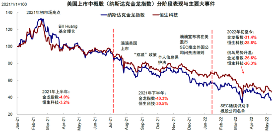 受監管等多重因素影響,中概股市場自2021年2月中旬以來便持續下跌,全年表現落后於幾乎全球所有大類資產。進入2022年,海外中資股市場一度領漲全球,然而2月中旬后情形急轉直下,3月更是連續急跌,劇烈程度表明一定程度上可能存在流動性的衝擊,其中一個原因便來自3月初SEC依據《外國公司問責法》將5家公司放入「初步識別名單」。慶幸的是,3月中旬金融委維穩信號及時穩住市場情緒,避免流動性衝擊導致的恐慌拋售進一步放大。截至5月15日,代表美國上市中概股的納斯達克金龍指數以及港股成長板塊的恆生科技指數今年已分別下跌31.4%和28.8%,而MSCI中國指數也回調了23.7%。