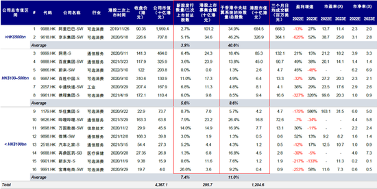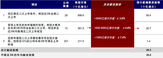 未來三年平均新增融資規模約300億港元,港股承接並無太大壓力。基於上述現已滿足二次上市的29家和未來3年內有較大概率滿足二次上市要求的13家公司全部迴歸,以及目前市值較二次上市最低要求有較大差距的公司中有10%在未來3年可滿足要求的情況下實現迴歸的三點假設,同時按照已迴歸公司不同市值的平均新發行股份比例分別加權計算(即流通市值大於5000億港元的公司平均新發3.9%;1000億至5000億港元公司平均新發5.6%;流動市值小於1000億港元的公司平均新發7.4%,如圖表14所示),我們估算,中概股迴歸未來三年可能帶來總計約865億港元的新增募資規模,平攤至3年相當於年均新增約290億港元募資金額,這一規模基本相當於2021年港股全年IPO融資規模(3,330億港元)的9%。因此單純的增量算不上很高。若考慮到部分二次上市或雙重主要上市以介紹方式上市,即不發行新股,則實際新增募資規模則會更低。