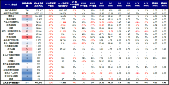 經歷自2021年以來大幅回調后,中概股市場當前交易在什麼位置?爲了更好的回答這一問題,我們通過FactSet對所有在美上市的271家中概股市值加權構建中概股整體及分行業(GICS二級行業)情況,同時對比中概股和港股各主要(如納斯達克金龍、MSCI中國、恆生與恆生科技指數等)來呈現當前中概股市場的基本面情況。我們發現,當前無論是我們構建的市值加權中概股指數或是納斯達克金龍指數的指數12個月前向市盈率,均已跌至長期歷史均值一倍標準差以下,估值已經處於明顯低位,但指數的盈利預期仍處於下修通道。