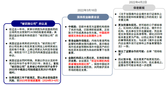 相關政策進展方面,2021年12月和2022年4月,國務院與證監會先后對起草《國務院關於境內企業境外發行證券和上市的管理規定(徵求意見稿)》與修訂《關於加強境內企業境外發行證券和上市相關保密和檔案管理工作的規定(徵求意見稿)》徵求意見,增加對間接赴中國香港和美國上市的境內企業的覆蓋,為跨境監管合作提供製度保障,這也為中美監管雙方合作留出了足夠的空間,進一步提升雙方合作的可能性。