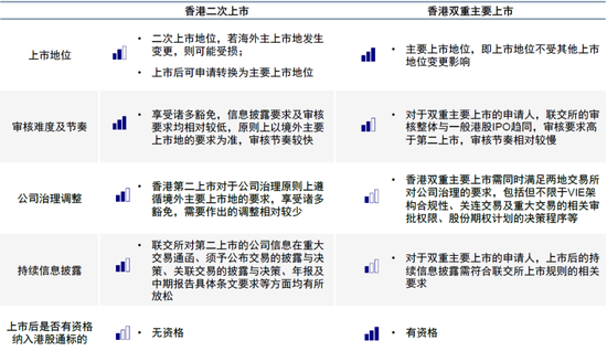 ► 雙重主要上市:標準和流程與首次公開發行基本相同,需要同時滿足兩個市場監管要求,雖然增加了企業的合規成本,但其主要上市地位則可以抵禦海外被迫退市等風險,也可以在滿足一定條件后成為港股通標的。