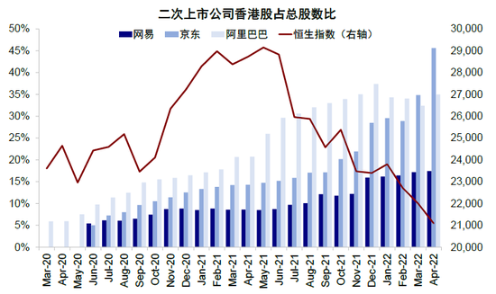 中概股股份轉換是一個漸進的過程、且隨着時間的推移而逐漸增多。以京東為例,其香港部分股份佔其總股數的佔比從2020年中的10%已經上升到當前超過40%的水平,阿里巴巴在香港部分股份也有35%左右。而網易港股部分佔比也有所提升。