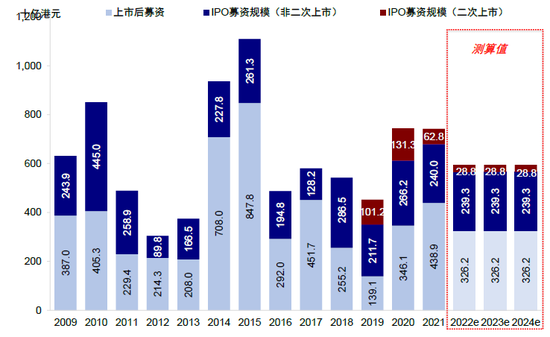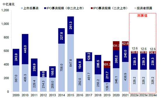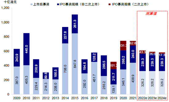 具體來看,中概股赴港二次上市在2019、2020和2021這3年期間的IPO募資額分別為1012億港元、1313億港元和628億港元。若未來3年普通(非中概股)IPO融資規模維持自2018年以來的均值水平,我們預計未來3年中每年港股IPO的整體融資規模將在3000億港元左右,基本維持2021年的水平。