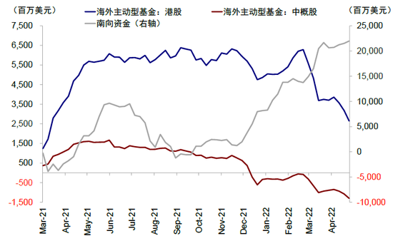 圖表9:三月以來,海外主動型基金分別連續流出港股以及中概股市場,而南向資金卻依然逆勢攀升